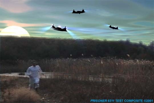 Prisoner 8311 Image 3 of 3 A still from a sci-fi short. The photo shows a composite image of a CG created sky, 3D modeled flying ships, and live action foreground. ( (Credit: photography, CG, compositing)
